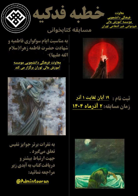به مناسبت ایام فاطمیه  معاونت فرهنگی دانشجویی موسسه آموزش عالی غیردولتی غیر انتفاعی توران برگزار می کند:
